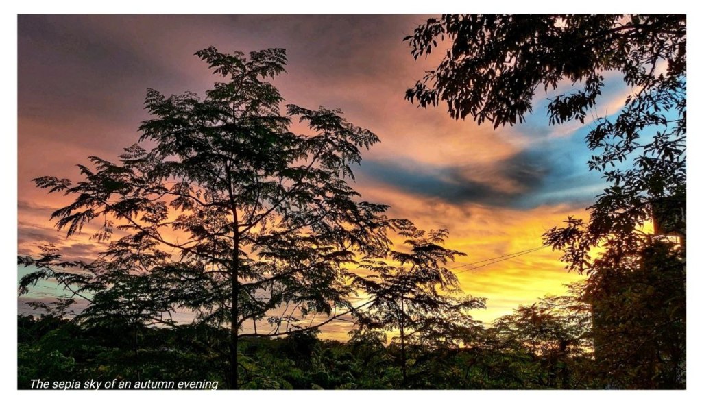October brings in a mixed sensation in the air – the reminiscent of blissful drizzles infusing with gentle autumn breeze beneath a sepia sky, sweeps away the perplexities of a slumber mind. I find these autumn evenings great for self-exploration, making one’s inner vision clear like the photo of the last strip of golden light that I could catch by my windowsill after a daylong downpour.