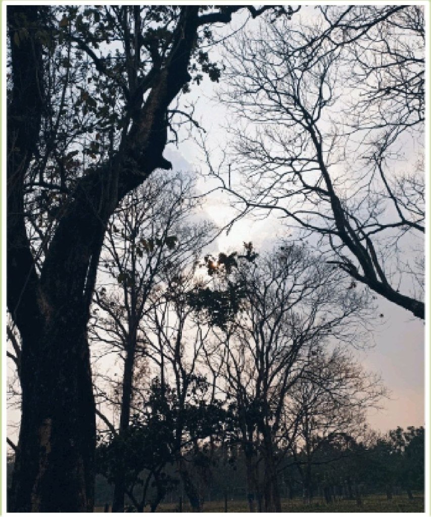The grammar of photography has never perturbed me. Someone once told me about the frame which my practice of framing has reduced to meaning ‘undisturbed background’, an ambience of seeming order. However, I feel, I care less of that as well nowadays, the need to pose things as orderly, tranquil. Maybe it is due to the unthought-of which surfaced to smother the seeming order of life during the pandemic that has led to this tiredness of posing ‘good times’. While becoming more inward looking, these years have also made me search without, outside of me, to understand more of me. While the curious transaction between within and without is sometimes incomprehensible, I didn’t realise, albeit in retrospect, that these pictures had randomly gathered in the photo gallery of my mobile phone- pictures of trees with their stark branches. It was while scrolling, mostly to clear memory, that the picture of these trees, which stand in the sprawling campus of the University of North Bengal, and some even outside of it, stared at me, almost coaxing me to recall the memory of the moment that turned me to them.